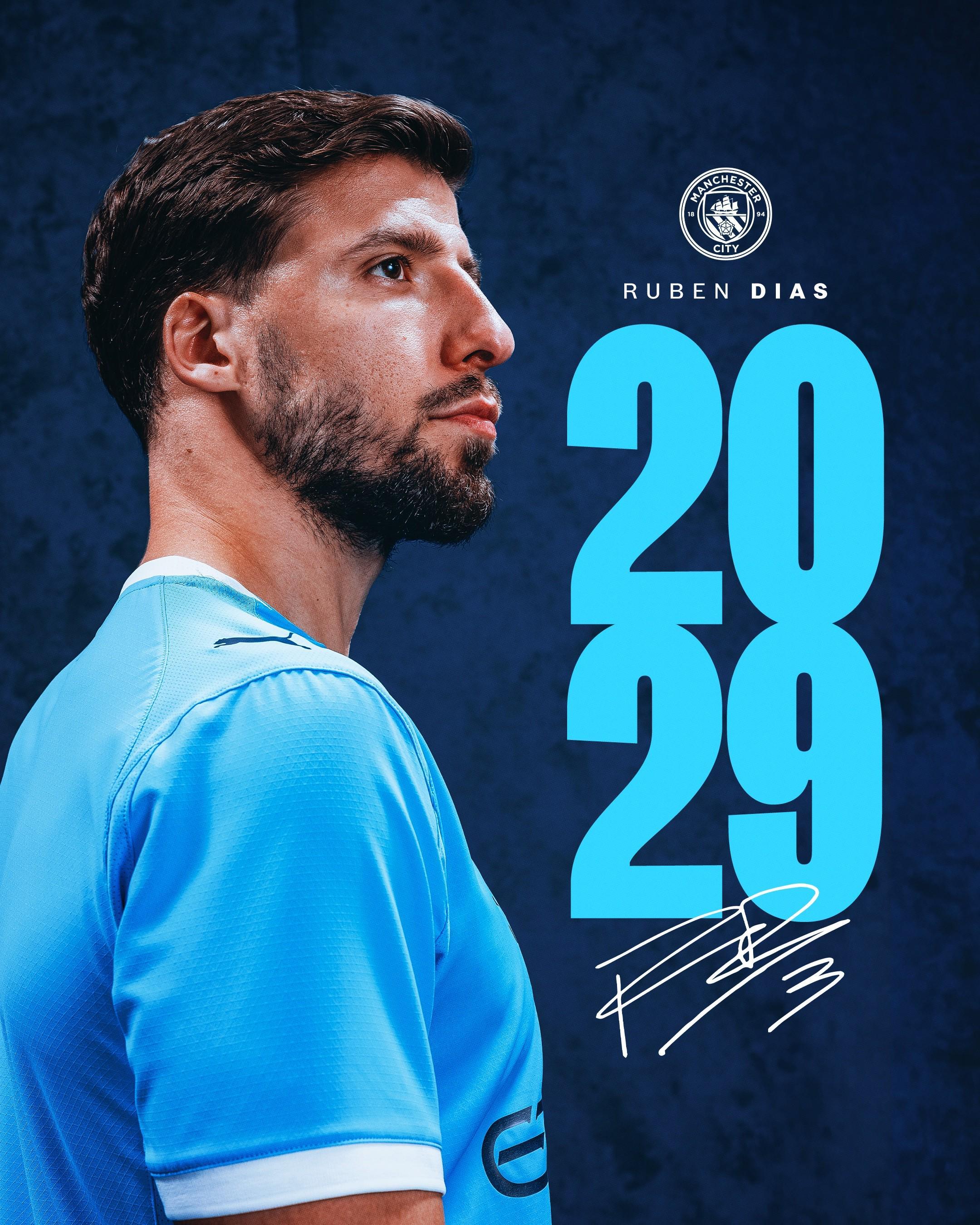 曼城官方宣布,与中卫鲁本-迪亚斯续约至2029年。